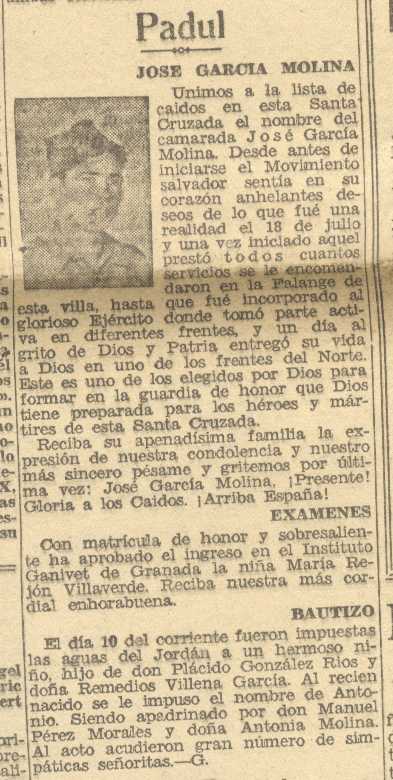 22 de octubre de 1938. Fallece en la guerra Don José García Molina de Padul