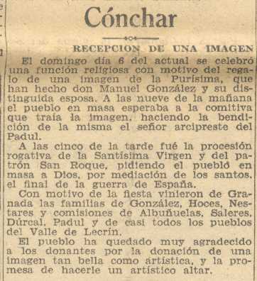 10 de noviembre de 1938. Recepción de una imagen de la Purísima en Cónchar