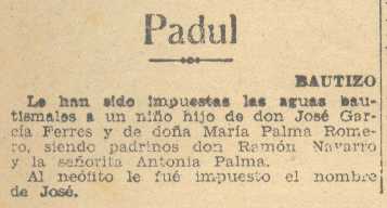 30 de noviembre de 1938. Bautizado en el Padul el hijo de Don José García Ferres y Doña María Palma Romero