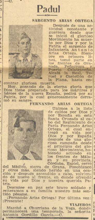 17 de septiembre de 1938. Fallecidos en la guerra Don Antonio Arias Ortega y Fernando Arias Ortega, ambos de Padul