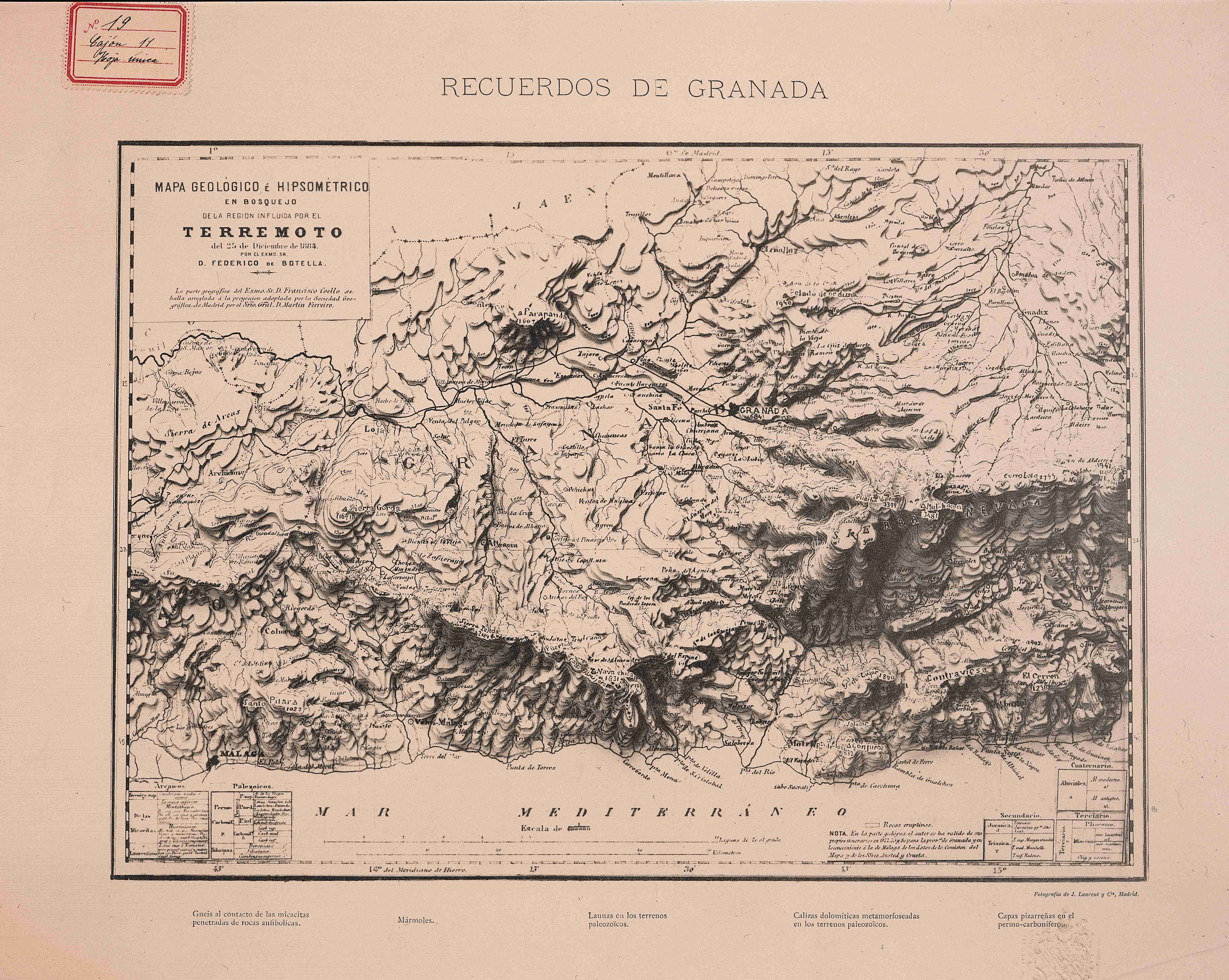 Recuerdos de Granada. Mapa Geológico é Hipsométrico en bosquejo de la región influida por el terremoto del 25 de Diciembre de 1884