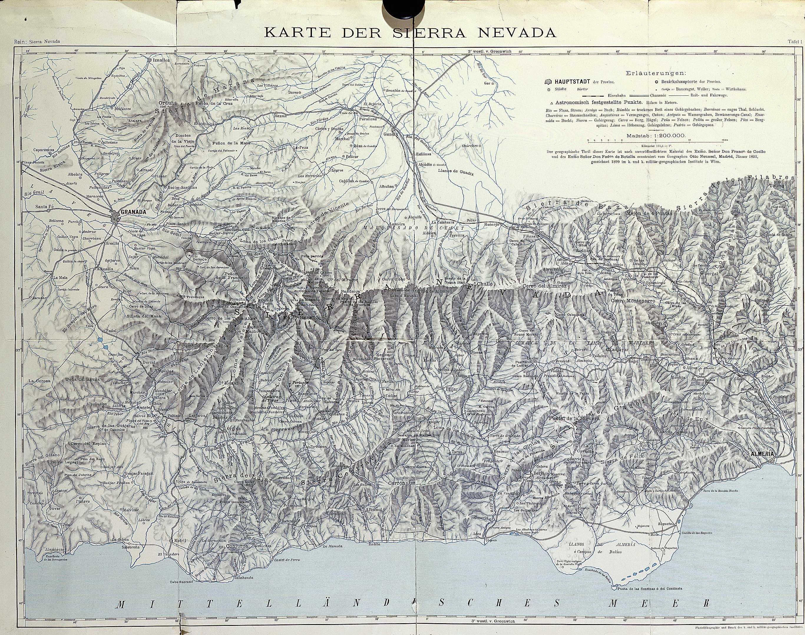 Es interesante señalar que este mapa emplea ya como meridiano de origen el de Greenwich, adoptado como meridiano inicial de uso internacional en la Conferencia de Washington de 1884; su efectiva aplicación en España, sin embargo, no llegaría hasta principios del siglo XX. Fue confeccionado inicialmente en Madrid en 1893, según se indica en uno de sus textos, por el geógrafo y grabador de cartografía alemán afincado en España Otto Neussel, con la intención de ilustrar el estudio divulgativo sobre los caracteres geográficos, geológicos y botánicos de Sierra Nevada que preparaba el geógrafo germano Johannes J. Rein tras los reconocimientos que había practicado en esta serranía andaluza en la década de 1870 y en 1892. En las leyendas del mapa se acredita asimismo que Neussel construyó la imagen a partir de bases cartográficas de Francisco Coello y Federico Botella, utilizando con toda probabilidad como modelo de referencia el mapa geológico e hipsométrico de la zona afectada por el terremoto de 1884 publicado por este último autor en 1885, dada la coincidencia de la mayor parte de los territorios reseñados en los mapas de Botella y Neussel. |