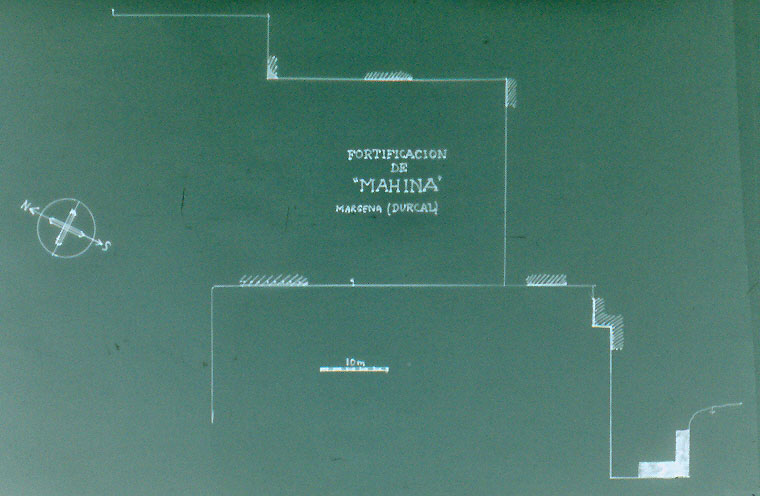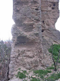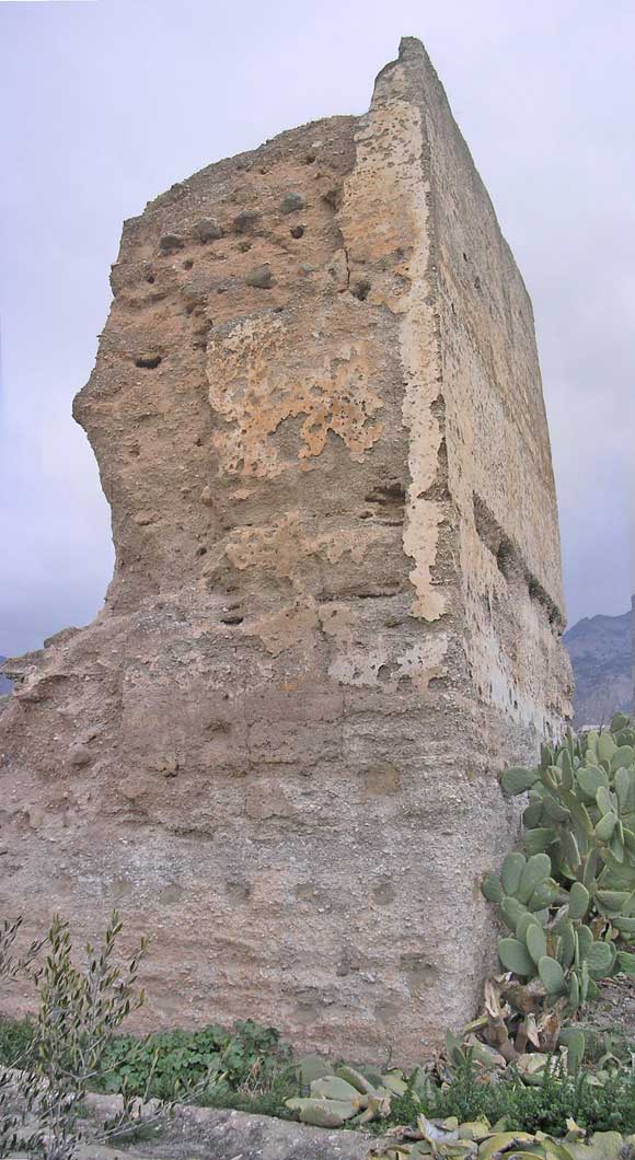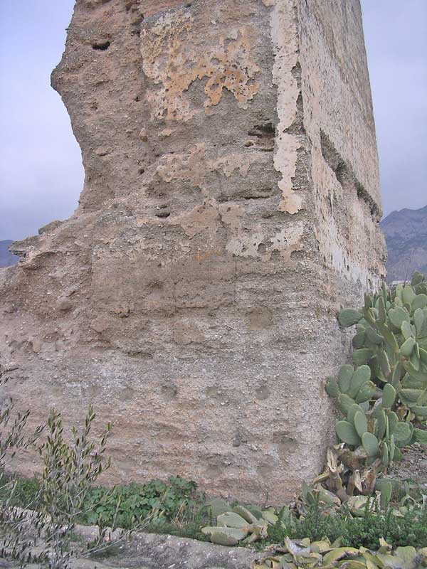 Sobre una base de mampuesto se eleva el muro con técnica de tapial de tierra y cal, es muy macizo en algunos casos por poseer grandes piedras. Exteriormente estos muros iban revestidos de un enlucido ocre-rojizo, que se ha conservado en bastantes zonas, y que le daba una apariencia homogénea a la estructura, este enlucido tenía un espesor de 4 mm., que se conserva mejor en su parte superior, mientras que en la inferior se degrada más rápidamente. La separación entre encofres tiene una medida de 90 cm. equivalente a dos codos ma’muni 37, observándose de forma precisa los mechinales.