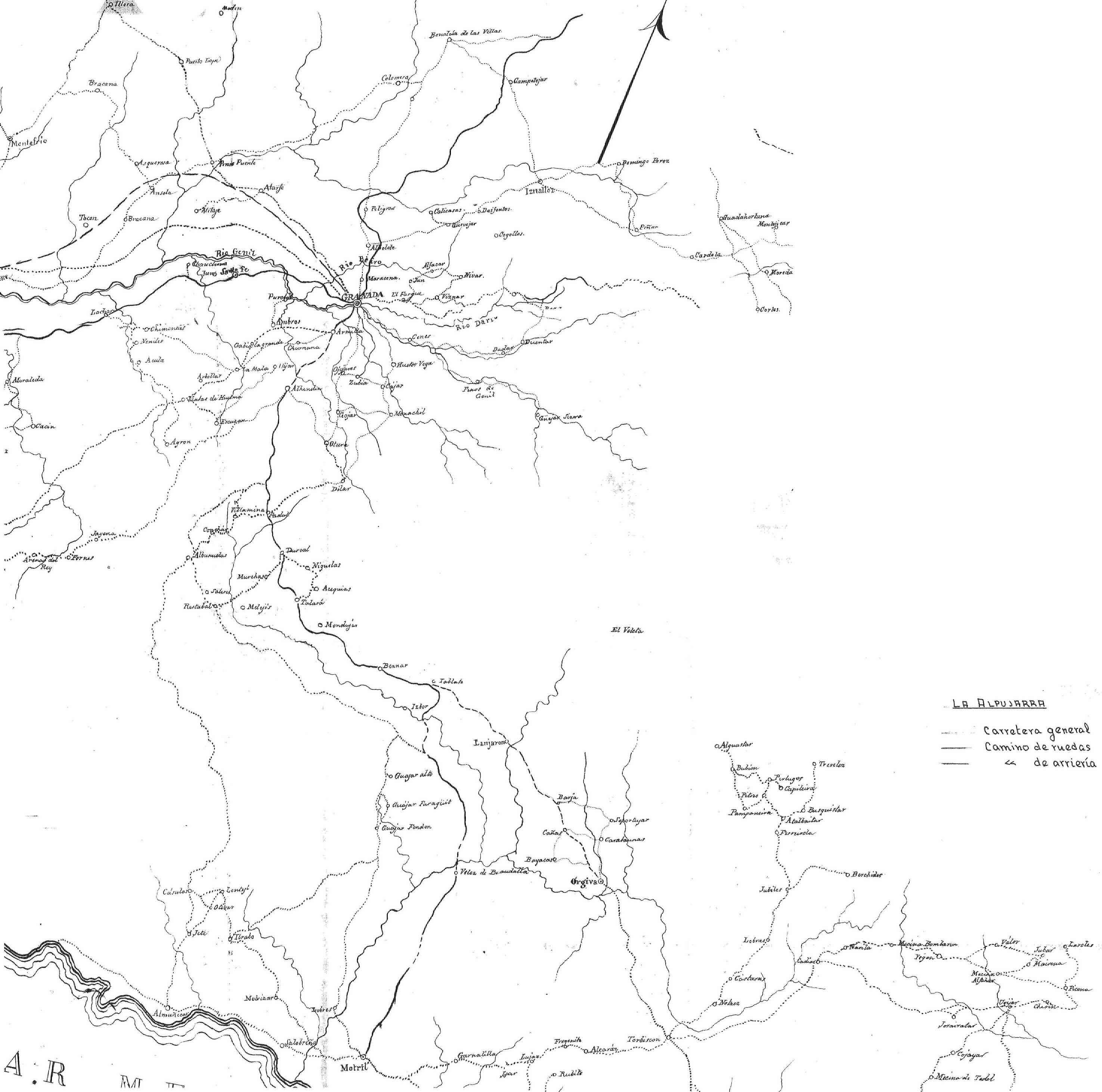 Caminos carreteros y de arriería según la Carta de la provincia de Granada de la Jefatura de Obras Públicas de 1.865
