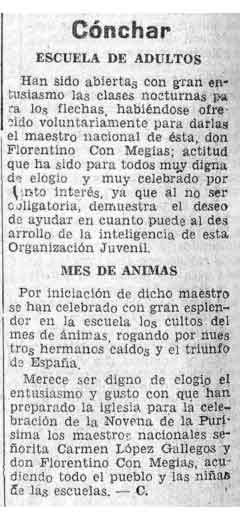7 de diciembre de 1937. Clases nocturnas y mes de las Ánimas en Cónchar. Maestro Don Florentino Con Megías