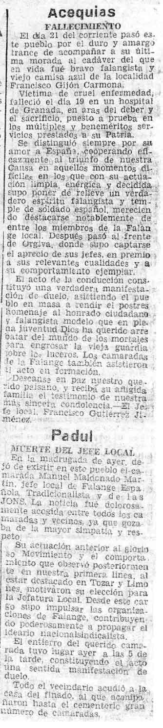 1 de febrero de 1938. Fallece Francisco Gijón Carmona en Acequias, Jefe local Francisco Gutiérrez Jiménez. Y en Padul Manuel Maldonado Martín (Jefe local)