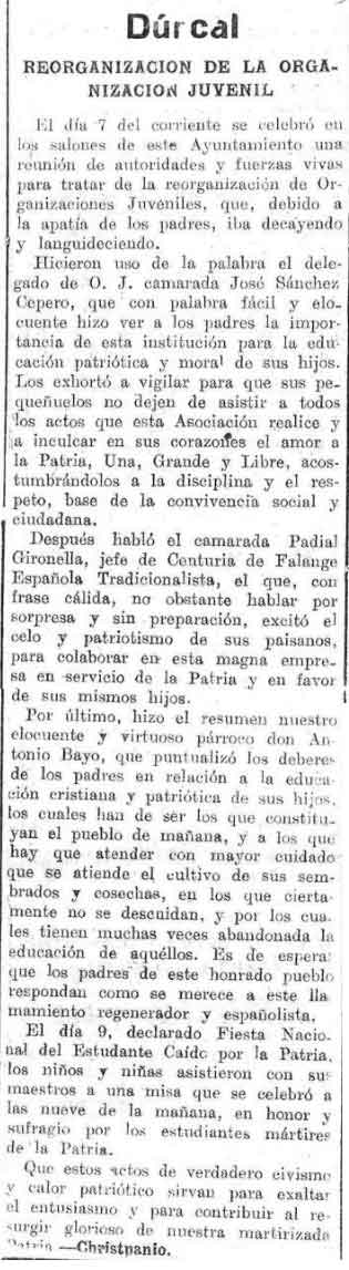 12 de febrero de 1938. Dúrcal. Reorganización de la organización juvenil. Párroco Antonio Bayo