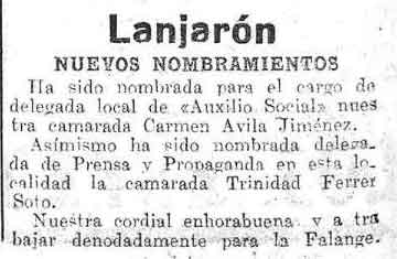 26 de febrero de 1938. Nombrada en Lanjarón Carmen Ávila Jiménez Delegada Local de Auxilio Social