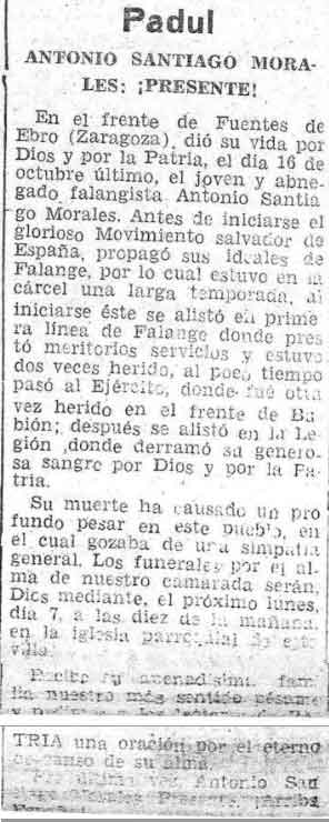 4 de febrero de 1938. Muere en el frente de Fuentes de Ebro el paduleño Antonio Santiago Morales
