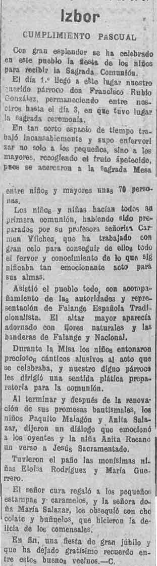 14 de junio de 1938. Fiesta de la comunión en Ízbor. Párroco Francisco Rubio González