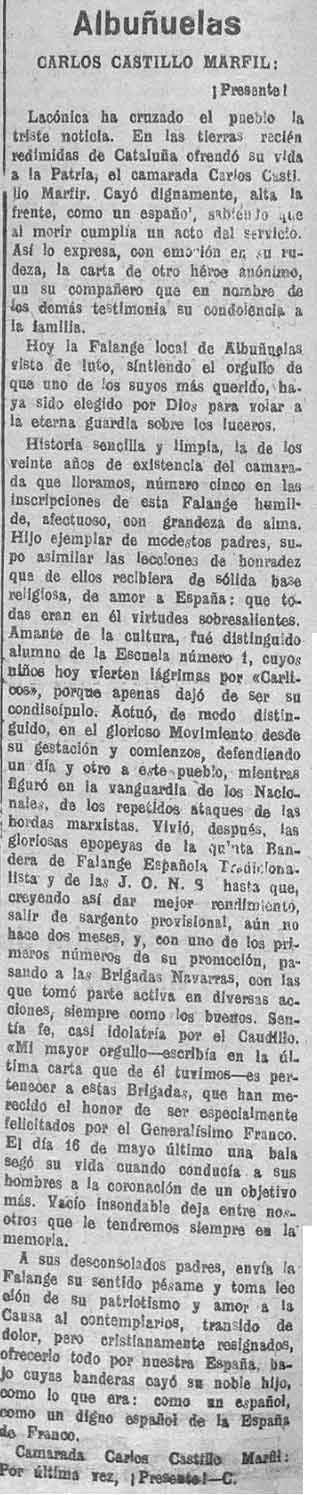 14 de junio de 1938. Muere en el frente de Cataluña Carlos Castillo Marfil de Albuñuelas