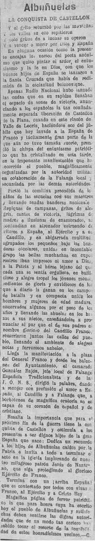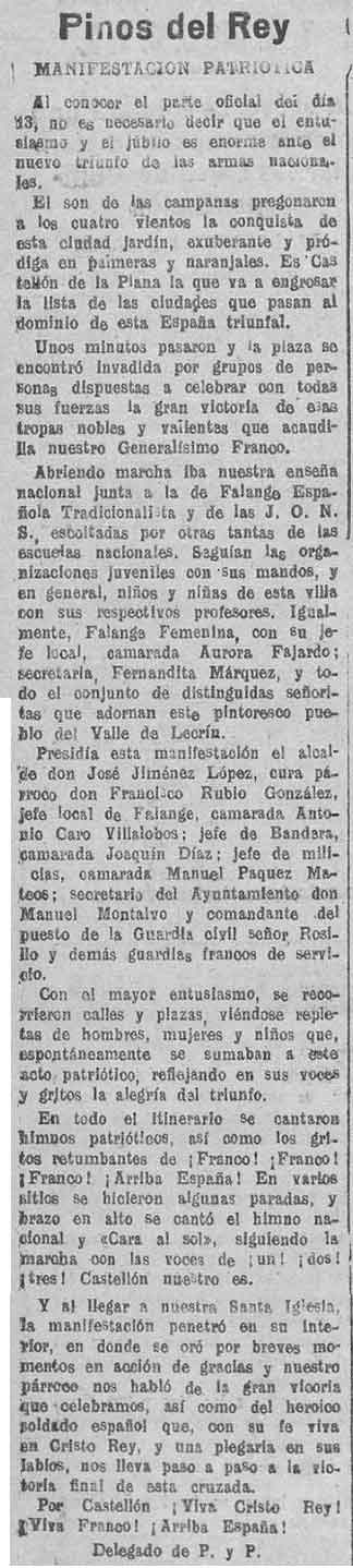 19 de junio de 1938. Se celebra en Pinos del Rey la caída de Castellón. Alcalde José Jiménez López