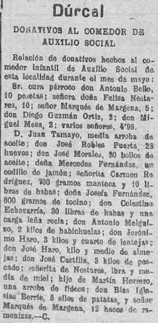 18 de junio de 1938. Donativos para el comedor de auxilio social de Dúrcal