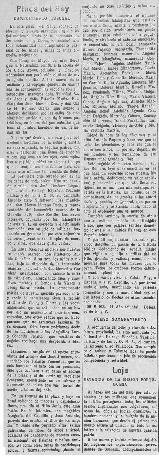 2 de junio de 1938. Cumplimiento Pascual en Pinos del Rey. Alcalde Don José Jiménez López
