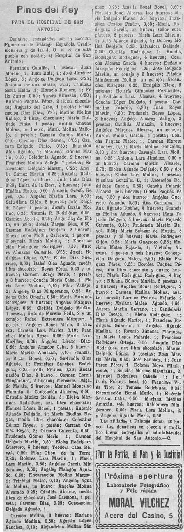 2 de junio de 1938. Donativos desde Pinos del Rey para el hospital de San Antonio