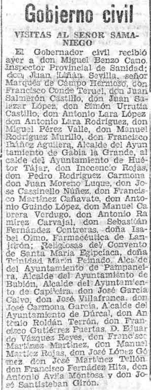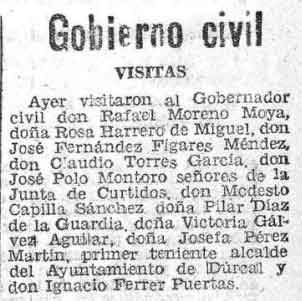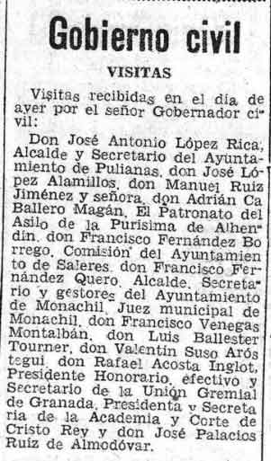 2 de agosto de 1938. Recibidos por el Gobernador Civil el marqués de Campo Hermoso, la farmacéutica de Lanjarón y al alcalde del Ayuntamiento de DúrcaL