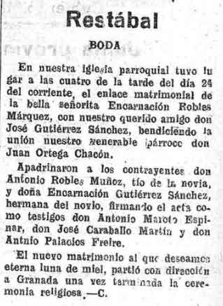 30 de agosto de 1938. Boda en Restábal de la señorita Encarnación Robles Márquez y Don José Gutiérrez Sánchez