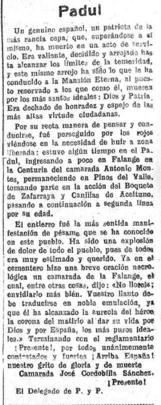 5 de agosto de 1938. Entierro en el Padul de José Cordobilla Sánchez