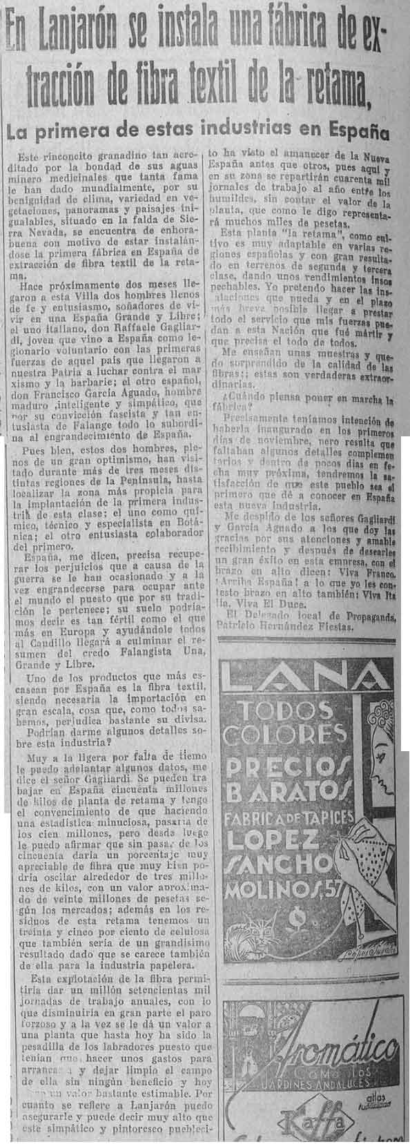 1 de diciembre de 1939. En Lanjarón se instala una fábrica de extracción de fibra textil de la retama