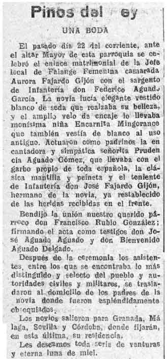 3 de febrero de 1939. Boda en Pinos del Rey de la jefe local de la Falange Aurora Fajardo Gijón con el sargento de infantería Federico Aguado García