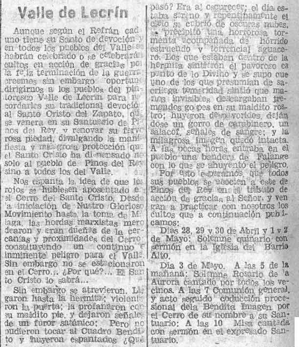 21 de abril de 1939. En el Valle de Lecrín celebran el final de la guerra y recuerdan que los rojos tomaron el cerro del Cristo de Zapato de Pinos del Rey y aunque entraron en la ermita no pudieron tocar el cuadro y huyeron espantados