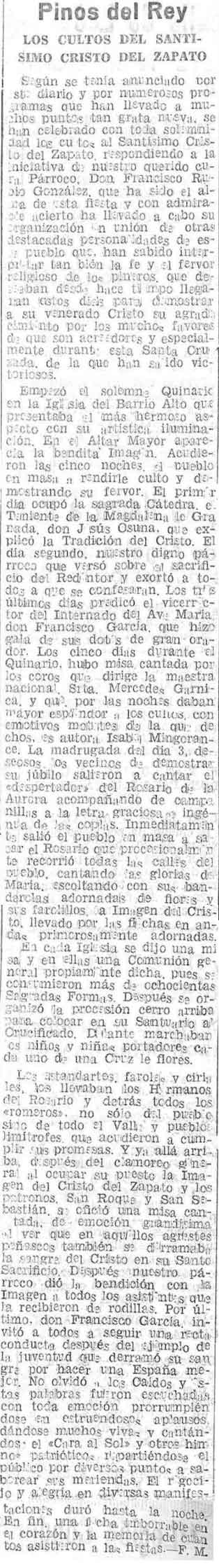 14 de mayo de 1939. Se celebran en Pinos del Rey los cultos al Cristo del Zapato. Párroco Don Francisco Rubio González