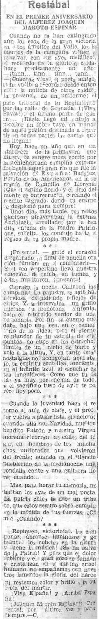 20 de junio de 1939. Primer aniversario de la muerte del alférez Joaquín Maroto Espinar en Restábal