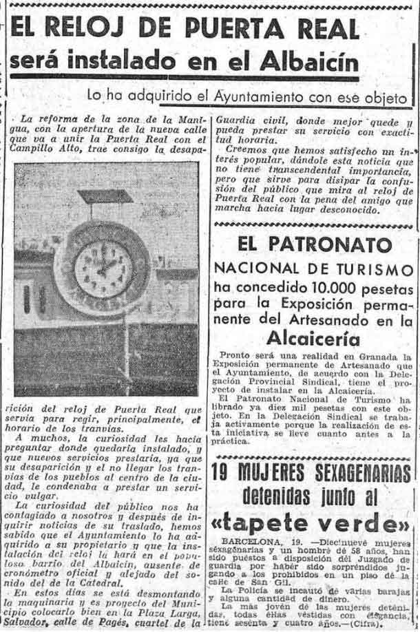 17 de octubre de 1940. El reloj de Puerta Real que se va a desmantelar, y que servía para regir el horario de los tranvías será instalado en el Albaicín