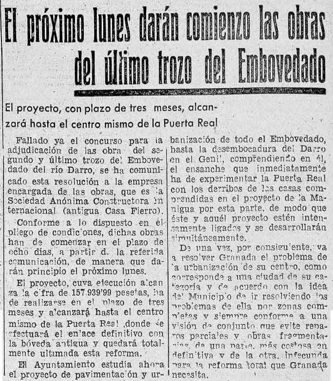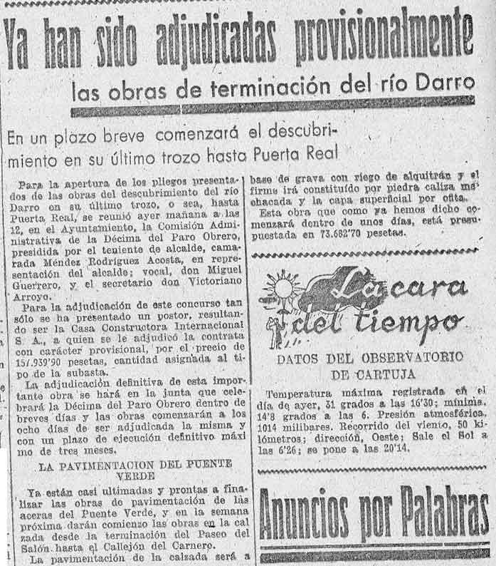 10 de agosto de 1940. Han sido adjudicadas provisionalmente las obras de terminación del Río Darro