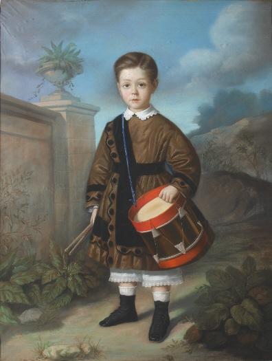 Retrato de niño de cuerpo entero. Ataviado con traje marrón con adornos y botones laterales negros y cuello blanco, pololos y botines. Con la mano derecha sujeta dos palillos y apoya la izquierda sobre un tambor que le cuelga del hombro derecho. Obra de cuidado dibujo, suave cromatismo y gran luminosidad conseguida mediante las cálidas texturas del pastel. Según el legado testamentario de María Cristina de Borbón y Bosch-Labrus, duquesa de Dúrcal, el niño retratado sería el padrino de la donante. La duquesa también donó otras obras al Museo Romántico como el pastel del mismo autor: "Pedro de Borbón y Borbón" (Inv. CE7197). Vemos en esta obra algunas de las características del retrato infantil: la representación del personaje sobre un fondo de paisaje y el acompañar a los niños de los objetos que le son propios como los juguetes e instrumentos musicales. Los instrumentos de percusión como el aquí representado se utilizaban también con un sentido mágico-religioso, ya que se creía que con su sonido se ahuyentaba a los malos espíritus que podían ocasionar daño a los pequeños. El autor de este pastel, José Parera, en varias ocasiones retrato a la nobleza y realeza como atestigua la efigie de "D. Alfonso de Borbón, Príncipe de Asturias", que presentó en la Exposición Nacional de Bellas Artes de 1866.