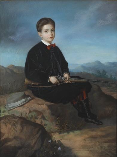 Retrato de niño de cuerpo entero, sentado sobre una roca, sujetando un rifle entre sus manos. Viste chaqueta de terciopelo oscura, chaleco, camisa blanca y pajarita bermellón. A su derecha y sobre la roca, se deposita un sombrero. Según la fisonomía del retratado y por el año de ejecución de la obra, 1868, podríamos estar ante una efigie del niño que se convirtió en el I duque de Dúrcal. Además en el legado testamentario de María Cristina de Borbón y Bosch-Labrus, duquesa de Dúrcal, se corrobora esta teoría. La duquesa donó al Museo Romántico esta obra exponiendo que el niño retratado era su propio abuelo. Pedro de Borbón y Borbón fue hijo del Infante Sebastián Gabriel de Borbón, del que el Museo del Romanticismo posee otro retrato (Inv. CE7196) firmado por Luis Ferrant e ingresado en el Museo por la misma fuente que éste. Este dibujo al pastel forma parte de la interesante nómina de retratos infantiles que posee el Museo del Romanticismo. En este tipo de representaciones los pintores solían recrearse en la descripción minuciosa de la indumentaria y en todo aquello que acompañaba a los infantes. El disponer a los niños en escenarios naturales era otra de las características de este tipo de imágenes. La blandura de la técnica, al pastel, contribuye a enfatizar la dulzura del retrato infantil. José Parera y Romero se formó en la Escuela de Bellas Artes de Barcelona. En su producción artística destacan algunas obras realizadas en acuarela o al pastel, como podemos comprobar en este papel. Recibió en numerosas ocasiones encargos del padre del niño aquí inmortalizado