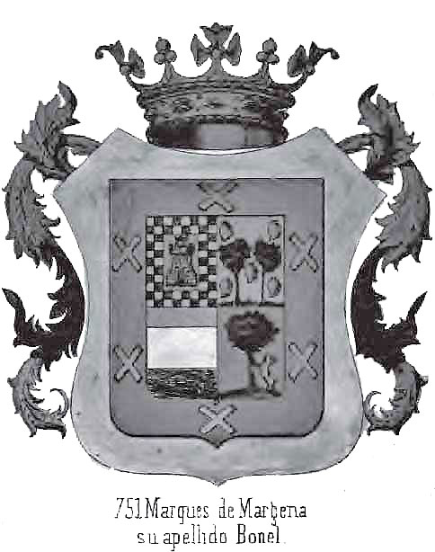 El primitivo Bon, que significa bueno propicio, ventajoso , modificado segun los pueblos y las edades, en Bone , Bonel , Boneli, Bonelus, Boni y Bonetu, se halla usado desde muy remotas siglas como nombre ó apellido de varones de gran valía, que han desempeñado los mas importantes cargos y obtenido las mas elevadas dignidades eclesiásticas y civiles, políticas y militares. Ya en el siglo VII, cuando el rey de Francia Tierry, á la muerte de su primo el rey Dagoberto, hijo de Sigisberto, rey de Austrasia, reunió este reino al de Francia, encomendó el gobierno de la Provenza á un santo y docto varon, llamado Bon ó Bona, en Iatin Bonitus, hijo de una de las principales familias de Auvernia. Gobernó Bonet con sumo acierto y prudencia tan importante provincia por espacio de nueve años, hasta que el espresado rey Tierry le designó para la silla episcopal de Clermont ; y despues de haber llenado dignamente durante diez años los altos deberes de su obispado, renunció á tan eminente dignidad, y repartiendo sus bienes á los hospitales , iglesias y monasterios, se encerró en la célebre abadía de Manlieu, donde espiró colmado de méritos y virtudes en el año 710. Menos de medio siglo despues, por los años de 750, otro santo varan llamado tambien Bonel ó Bonitu, descendiente de la misma ilustre familia que el anterior, fué arzobispo de Toledo. En el año 1155, el emperador Don Alonso y su esposa la emperatriz Doña Rica dieron á la catedral de Burgos el lugar de Villa Ayudo, y entre los candes y demás nobles caballeros que despues de los infantes confirmaron la donación, se halló Diego Fernandez de Bonel , merino mayor de Burgos. Una ilustre casa del apellido Bonel, sincopado en Boni, floreció en Milan y fué fecunda cuna de varones esclarecidos, algunos de los cuales vinieron á pelear contra los moros de España, bajo las gloriósas banderas de Don Jaime I. En aquellas mismas guerras se distinguió Nicolás Bonet, rico y valiente caballero, que dió señaladas pruebas de valor en la conquista de Mallorca, siendo suya la galera en que iba la vanguardia del ejército conquistador. En unas tierras suyas se fundó la villa de Santany , donde todavia en nuestros dias existe una casa solariega perteneciente á los descendientes de aquel ilustre varon. En el siglo XVI floreció Miguel Boneli, primo del Papa San Pio V y cardenal de la S. R. I., el cual pasó á Francia, España y Portugal por legado del Sumo Pontifice para promover y escitar la cruzada contra tos turcos, grangeándose la benevolencia de los príncipes, quienes le obsequiaban á porfía, de modo que nuestro monarca Felipe II le dió una vagilla de plata, siete mil escudos de renta y la villa de Boscho, donde nació, cerca de Alejandría de la Palla ó Paja, en el Piamonte, y el rey de Francia le regaló un diamante ricamente engarzado con esta inscripcion: Non minus hac solida est pietas: ne píelas possil mea sanguine solvi. En el siglo siguiente Carlos Boneli, de la misma noble estirpe, sobrino del espresado Papa San Pio V, fué arzobispo de Tarso in parlibus, gobernador de Roma, nuncio de Su Santidad en España, y tambien como el anterior cardenal de la S. R. I. La particular satisfaccion que su elevacion al cardenalato causó á nuestro monarca Felipe IV , se manifiesta en la honorífica carta que literalmente copiamos en la nota abajo puesta1 A principios del mismo siglo XVII, en el año 1620, Juan Pablo Bonet, natural de Aragon, empleado en el ministerio de Artillería y secretario del condestable de Castilla, publicó una preciosa obra para instruirá los mudos de nacimiento, que por sí sola en cualquiera otra nacion hubiera inmortalizado su nombre, correo ha sucedido con el abate de l' Epée, tan celebrado en Francia por haber publicado en el siglo pasado una obra del mismo género, siendo de presumir que se haya utilizado del genio y conocimientos de nuestro benemérito Bonet. El célebre marino Claudio Francisco Bonet fué á la isla de Madagascar, donde llegó hasta la dignidad real, y murió siendo rey de dicha isla. Así como han sido muchos los nobles varones que han sostenido y enaltecido el esplendor de aquella antigua y calificada casa de Bonet de Auvernia , así muchos han sido tambien los solares que han fundado en varias partes de Europa y principalmente en muchos puntos de España , siendo los mas antiguos los de Asturias, Navarra y Aragon , estendiéndose despues en Cataluña, Valencia, Andalucía, Islas Baleares y en las Indias Orientales y Occidentales. En fin, correspondió á tan antiguo y calificado linage, en la rama de Andalucía, en la provincia de Granada, gozando de la hidalguía que obtuvieron sus progenitores, reconocidos por aquella estinguida cancillería en la sala segunda que fué de hijos+dalgo, en la comarca del valle de Lecrin, usando el escudo y blason de sus armas, Don Nicolás Bonel y Martin de Montalvo, que fué regidor perpétuo de Pinos del Valle hasta la estincion de dicho oficio. Casó Don Nicolás con Doña Ana María de Orbe y Orbe Aguado y Lopez de Guzman, de cuyo noble consorcio son hijos el Eminentísimo Señor Don Juan José Bonel y Orbe, arzobispo de Toledo; y el Escelentísimo Señor Don Nicolás Bonel y Orbe, marques de Margena, como se espresa en los apuntes genealógicos puestos á continuacion. Las armas que ostenta la casa de los marqueses de Margena son: Escudo cuartelado; el 1º de gules, un castillo de oro con cuatro almenas, aclarado de azur con dos lebreles atados á la puerta y sumado de un bonete de sable; orla jaquelada de plata y azur; el 2º de oro, dos pinos y cinco panelas de gules puestas en sautor; el 3° de plata , el gefe de oro y la punta con ondas de plata y azur; el 4° de gules y un árbol con una cabra ó macho cabrío empinante al tronco; bordura general de gules y seis aspas de oro: timbrado el escudo con la corona de su título1