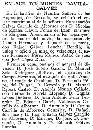 30 de Noviembre de 1957. Matrimonio de Don Nicolás Montes IV Marqués de Márgena con Encarnación Gálvez