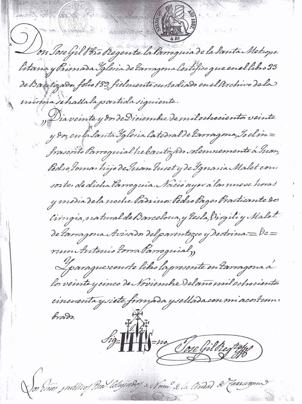 Bauticé el 22 de diciembre de 1822 a D. Juan Pedro Tomás, nacido el 21 de