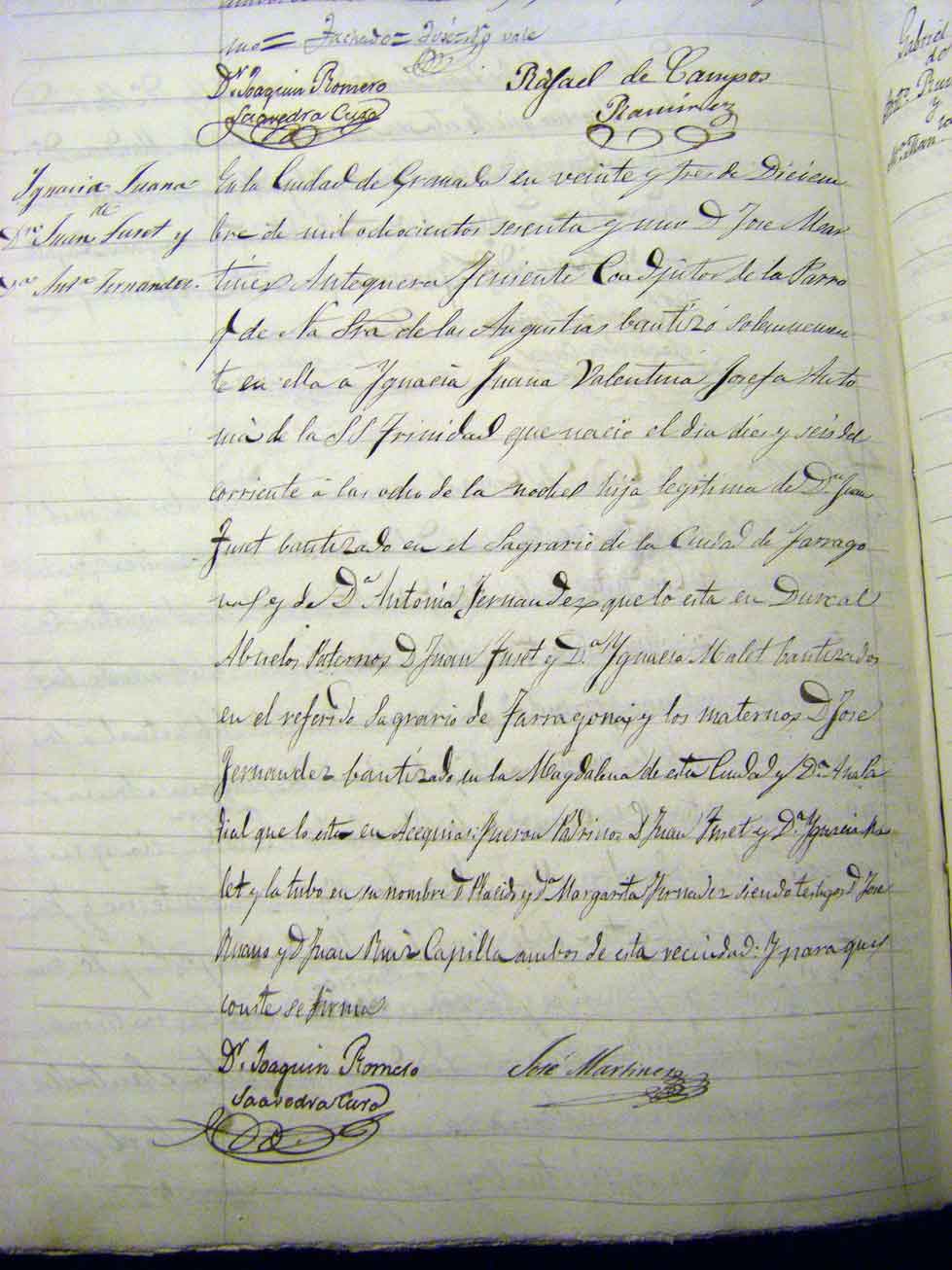 Como vemos por la documentación es la única de los hijos de D. Juan Tuset y Fernández y Dońa Antonia Fernández Padial que fue bautizada en la iglesia de las Angustias. Con esto podemos corroborar que al principio de su casamiento D. Juan Tuset no vivió en Darro Cubierto del Santísimo.
