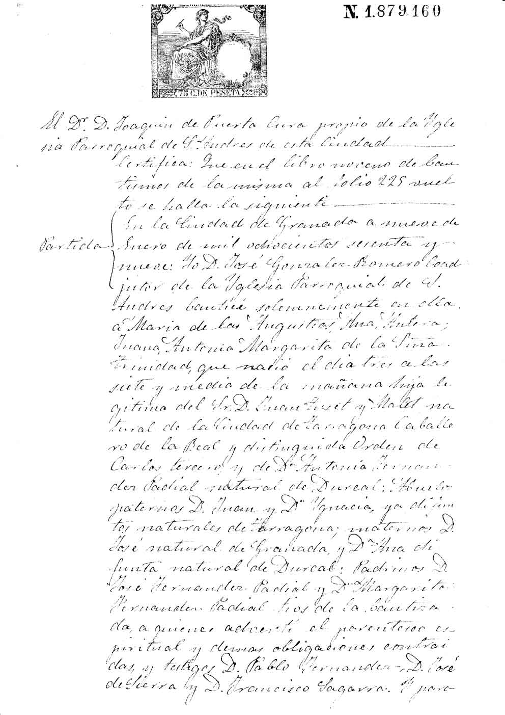 Bautizó el 9 de Enero de 1869, en la Iglesia de San Andrés. María