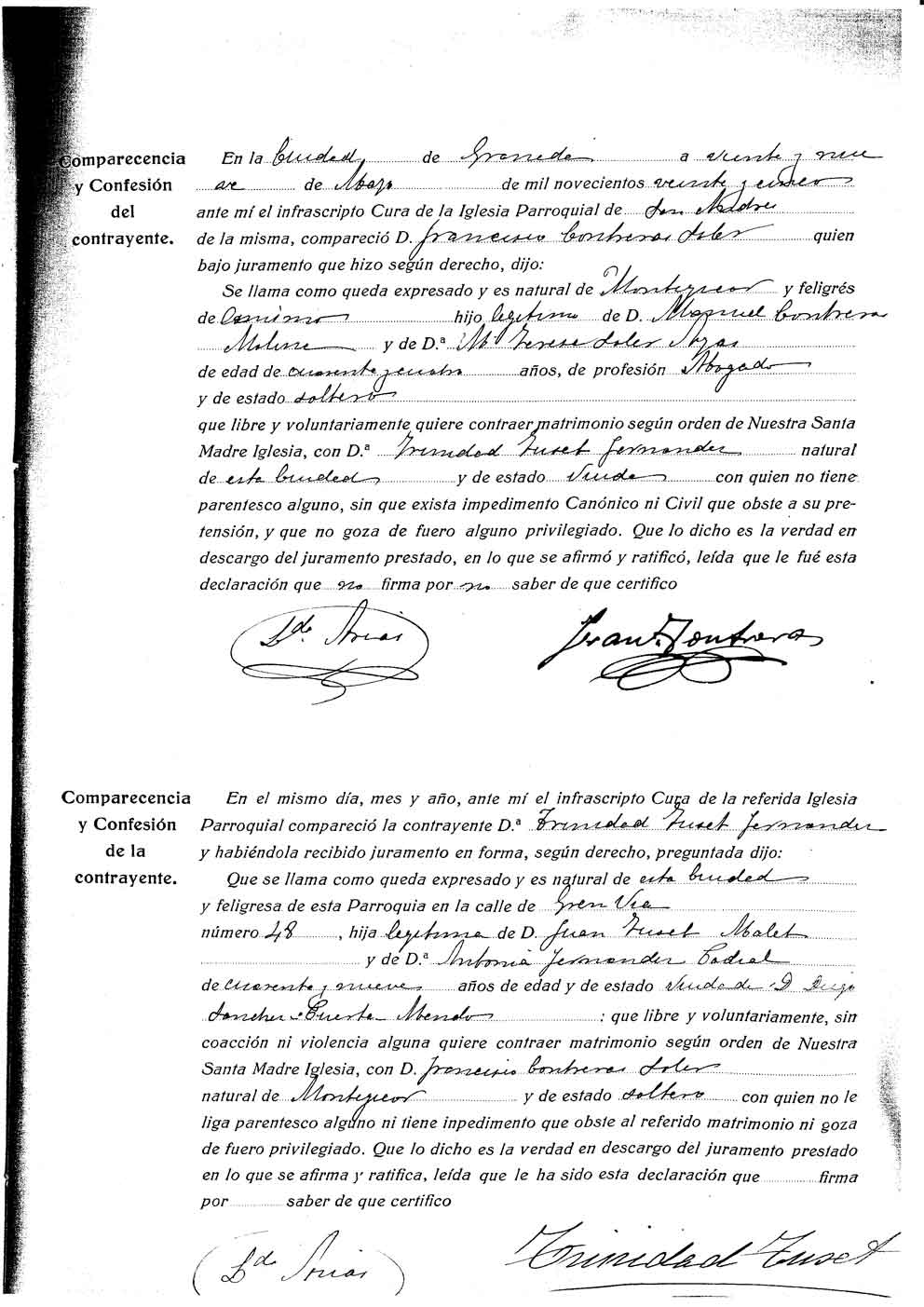 Comparecencia y confesión antes del matrimonio de Don Diego Sánchez Mendo Y Dña. Trinidad Tuset Fernández