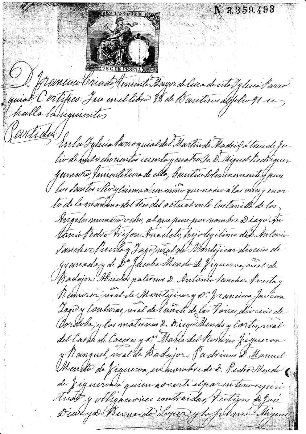 NOTA ACLARATORIA: Con esto queda aclarado la confusión de los apellidos de D. Diego Sánchez-Puerta y Mendo,