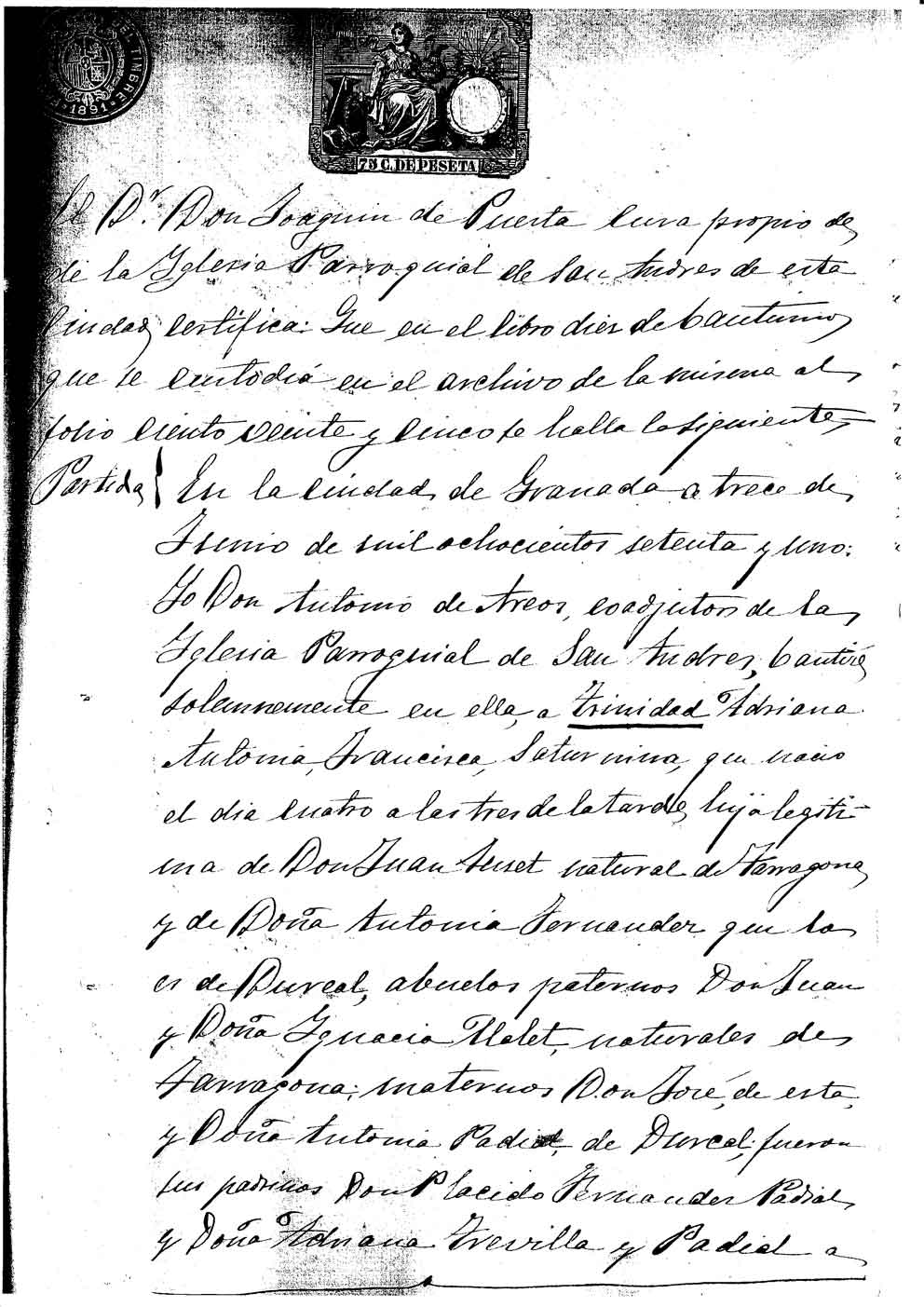 Partida de bautismo de Dña. Trinidad, Adriana, Antonia, Francisca, Saturnina