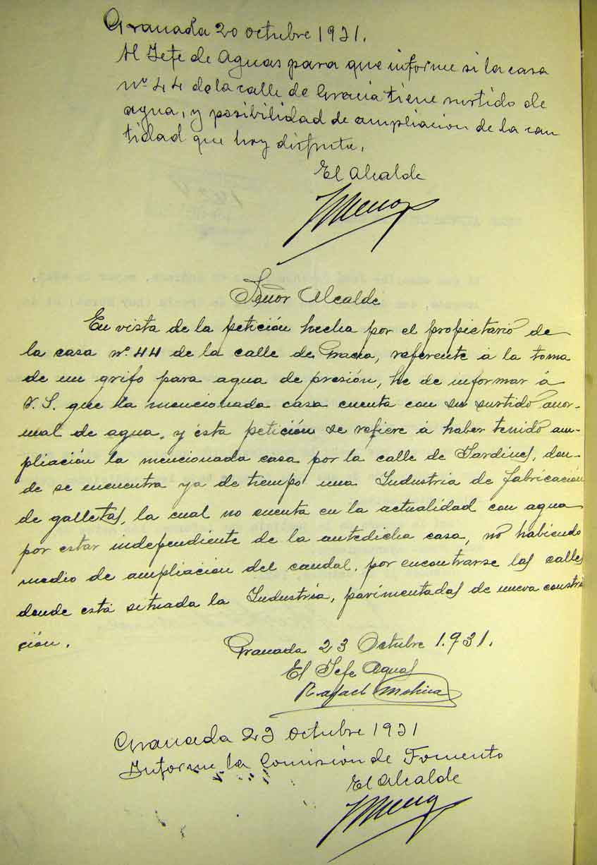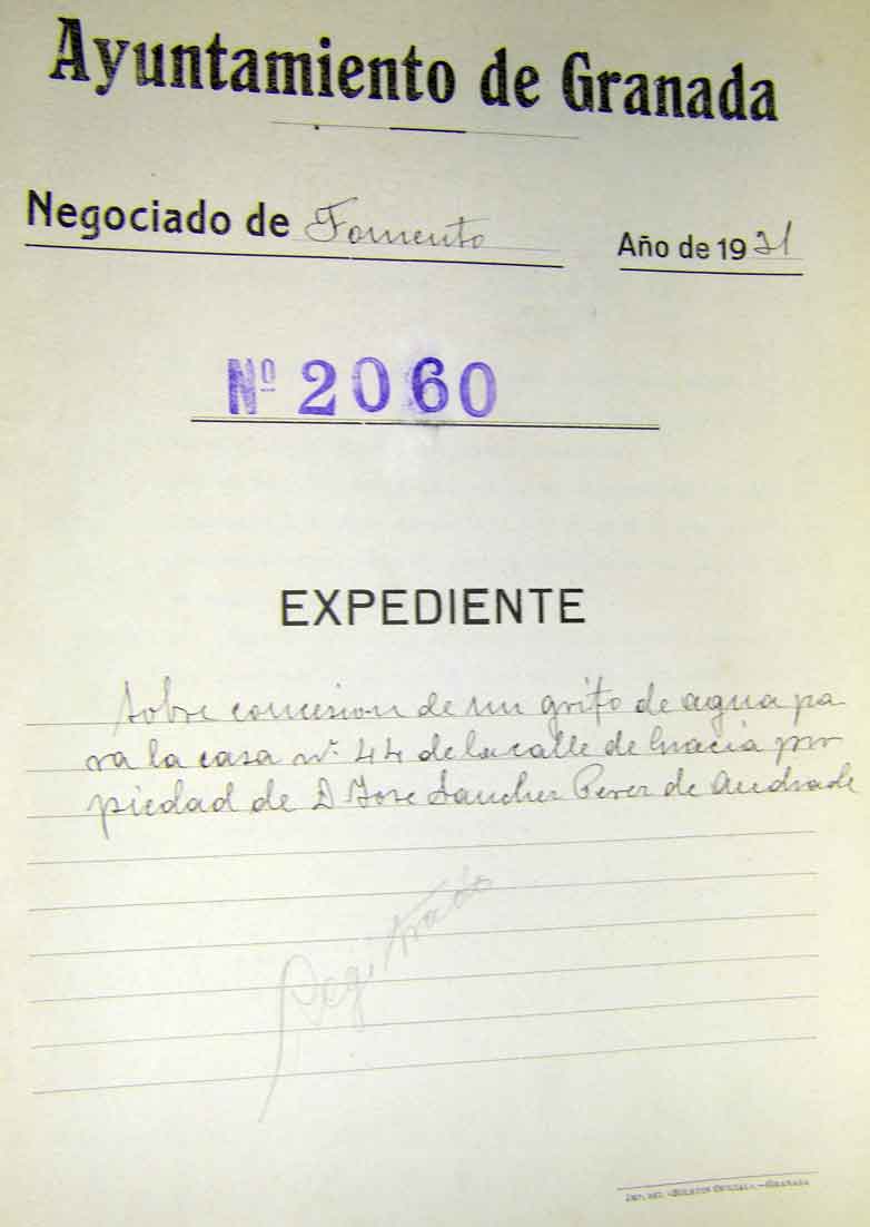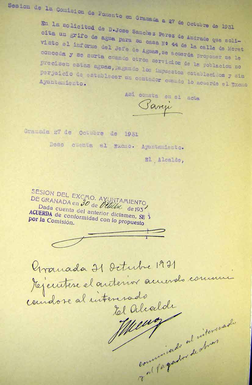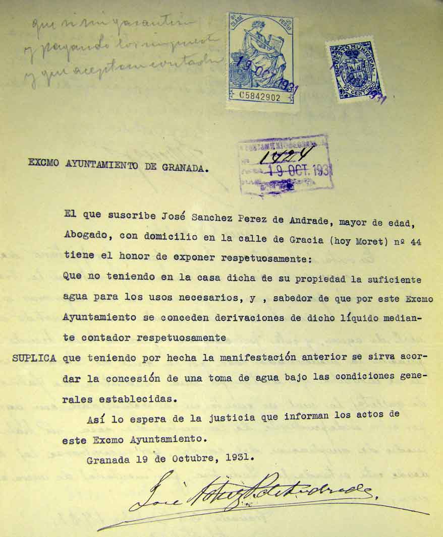 José Sánchez Pérez de Andrade ya vivía en esta casa en 1931 según nos atestigua la solicitud que hizo al ayuntamiento para poner un grifo