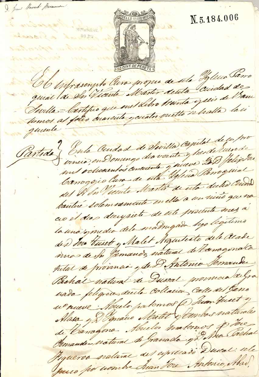 Nota: Después de dos años de estudios e investigación, gracias al doctor Don Ambrosio Esteva Rodríguez tenemos la oportunidad todos los interesados en conocer el bautismo de Don Juan Tuset y Malet