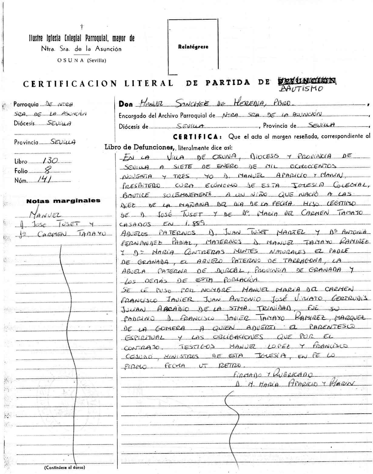 | "Ha fallecido en Sevilla el digno Capitán provisional del Centro Transmisiones Jefe de la Estación Radiotelegráfica Militar permanente de esta plaza D. Manuel Tuset Tamayo. Su viuda e hijos se le envían nuestro pésame más sentido" |