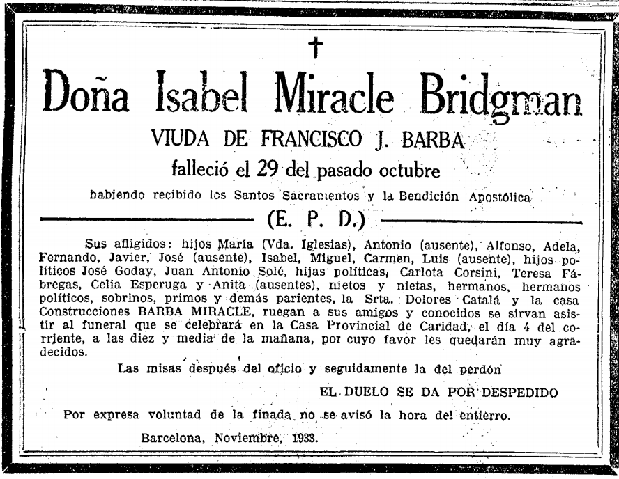 ![]() Esquela de Doña Isabel Miracle Mircala. Periódico La Vanguardia, 2 de noviembre de 1933. |