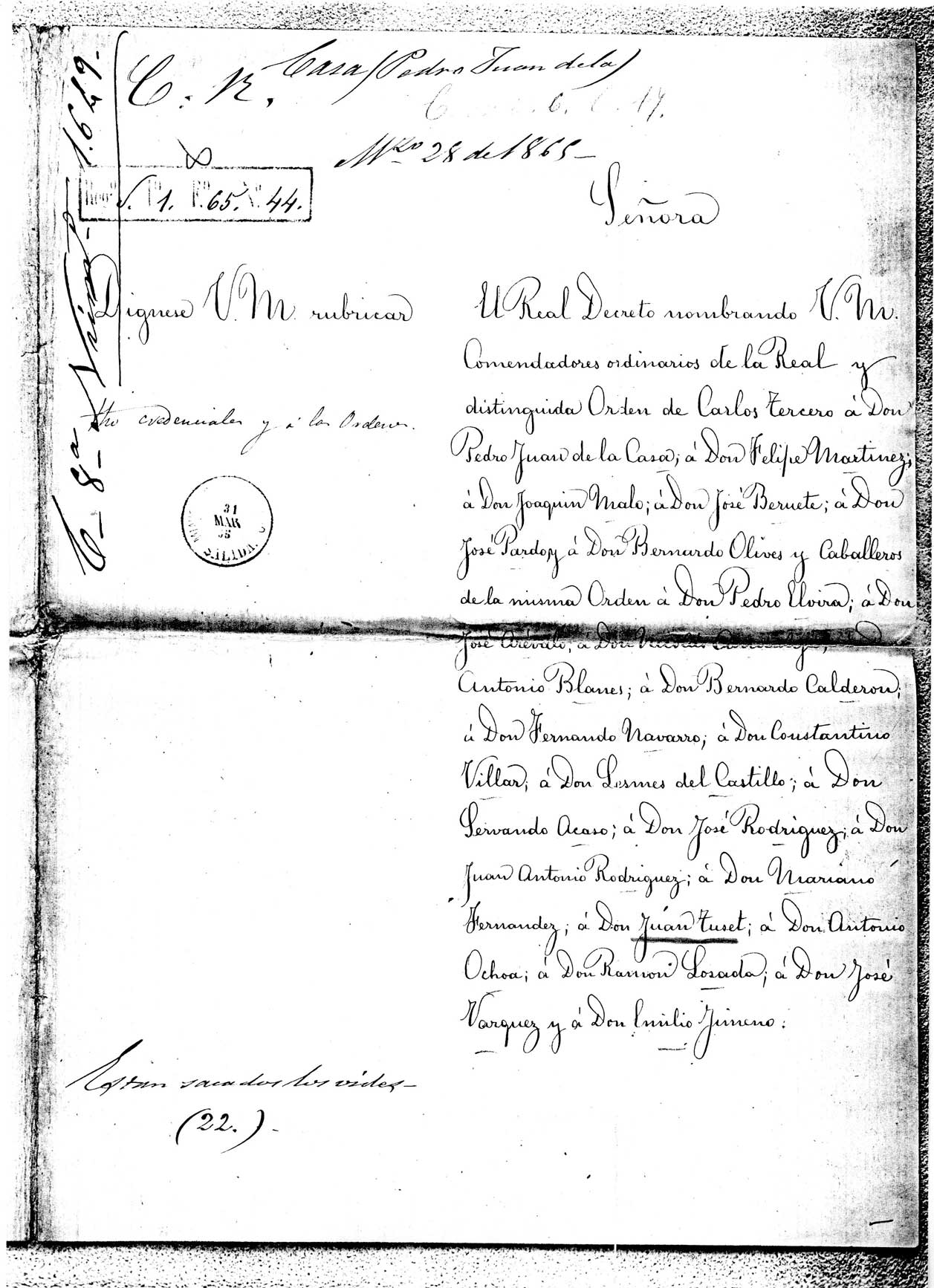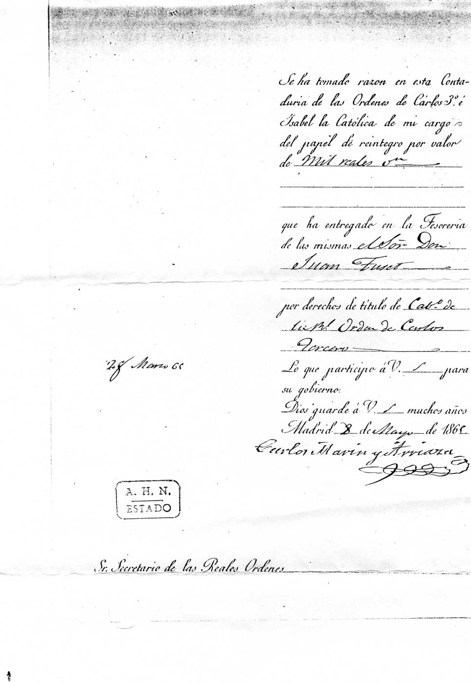 Documentos por los cuales se le le nombra Comendador Ordinario de la Orden de Carlos III a D. Juan Tuset y Malet, pasando así a formar parte de la clase nobiliaria de entonces. Pulsa sobre los documentos si quieres agrandarlos