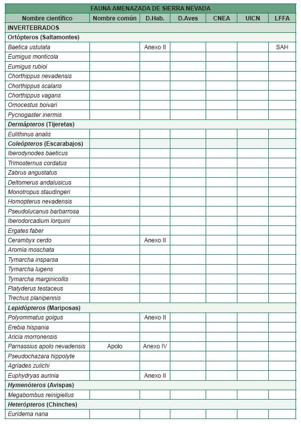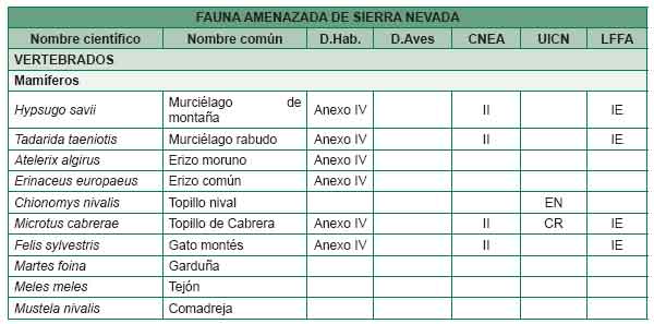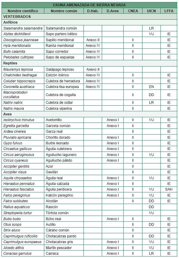 | Especies amenazadas de Sierra Nevada (incluidas en listados de protección de