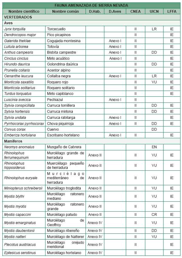 D.Hab. = Directiva 92143 de la Unión Europea relativa a la Conservación de los Hábitats Naturales y de la Fauna y Floora Silvestre: Anexo II = de interés comunitario general según el Anexo II Anexo IV = de protección extricta según el Anexo IV D. Aves = Directiva 791409/CE y Directiva 911294/CE referente a la Conservación de las Aves Silvestres: Anexo I = aves que deben ser objeto de medidas de conservación del hábitat. CNEA = Real Decreto 439190, en el que se establece el Catálogo Nacional de Especies Amenazadas: I = En Peligro de Extinción II = De Interés Especial UICN = Categoría UICN (Unión Internacional para la Conservación de la Naturaleza) para Andalucía: EX = Extinta CR = En peligro crítico EN = En peligro VU = Vulnerable DD = Datos insuficientes LR = Bajo riesgo LFFA = Ley 812003 de Flora y Fauna Silvestres en Andalucía: IE = Interés Especial |