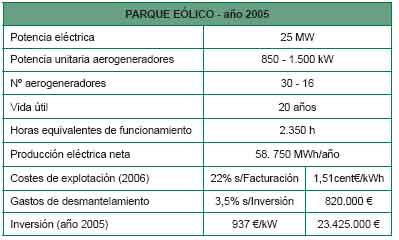 El Plan de Energías Renovables de España, 2005-2010, define los principales parámetros de una instalación "eólica tipo" con aprovechamiento energético. Estos datos se recogen en la tabla que se expone.