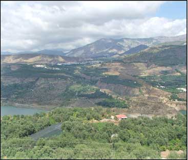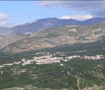 | Núcleo de Melegís se extiende en una llanura próxima al embalse de Béznar. | Desde el mirador se aprecian los dos núcleos que, junto a Melegís, constituyen el municipio de El Valle. |