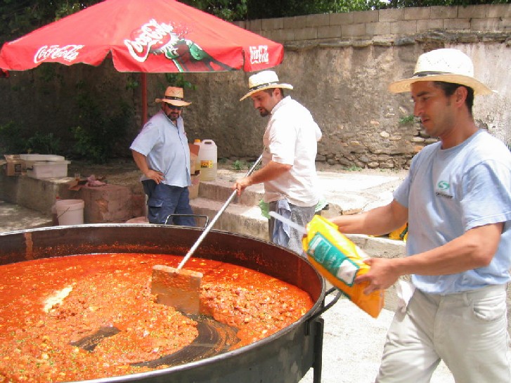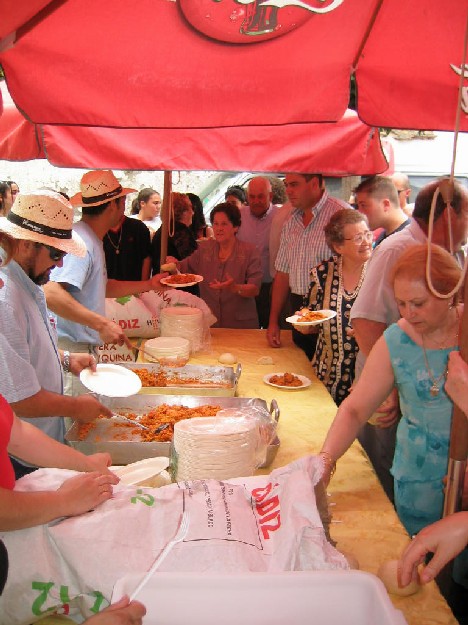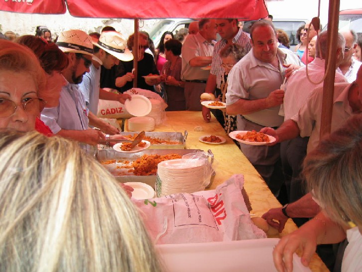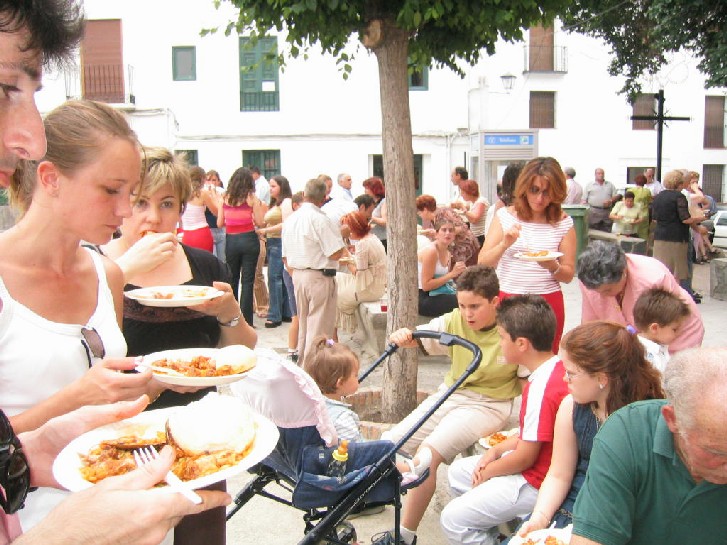 A las 14,30 horas tuvimos una gran paella popular en la plaza del pueblo, que estuvo buenísima y dio de comer a cerca de 800 personas. Fue elaborada con 50 kilos de pollo, 20 Kg. de cerdo, 25 Kg. de calamares y 70 Kg. de arroz y que fue financiada por el Ayuntamiento de El Valle.