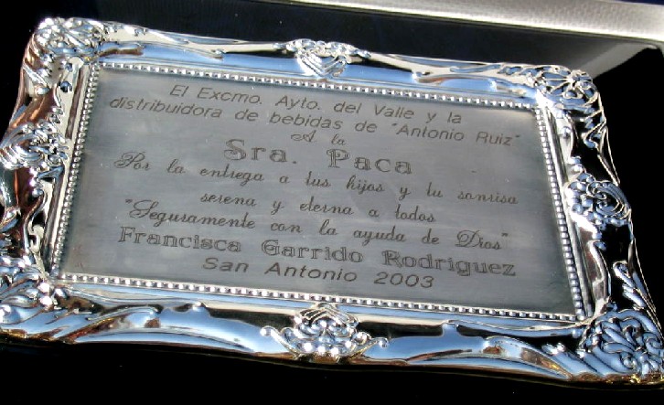 Y a "la señora de la sonrisa eterna", como ya se le ha denominado, a continuación de la entrega de las flores y la placa se le dedicó la canción "Color Esperanza", el presentador no dejo de repetir " Paca la gente te quiere". Fue unos momentos muy emotivos en los que la emoción colmo de lágrimas el rostro de Paca y impregnó hasta el fondo de nuestros corazones.